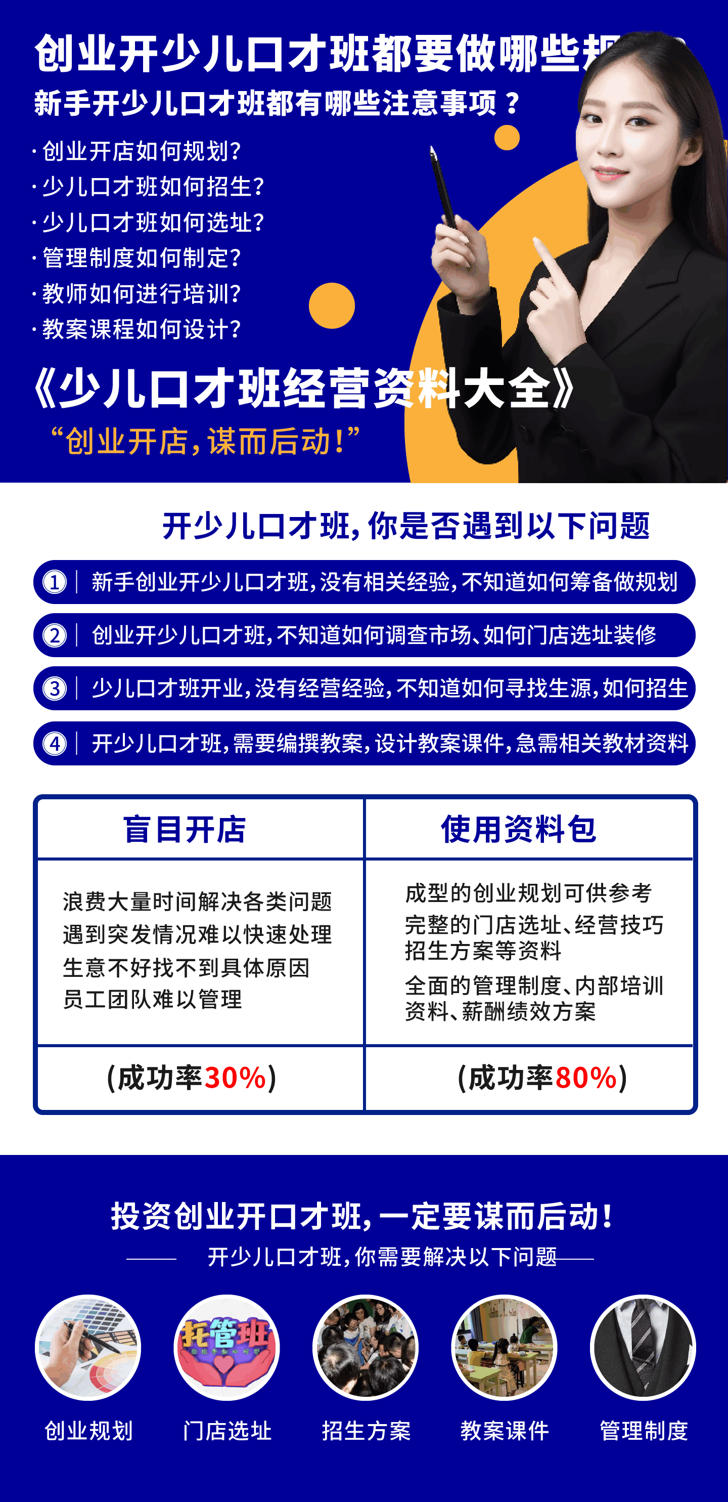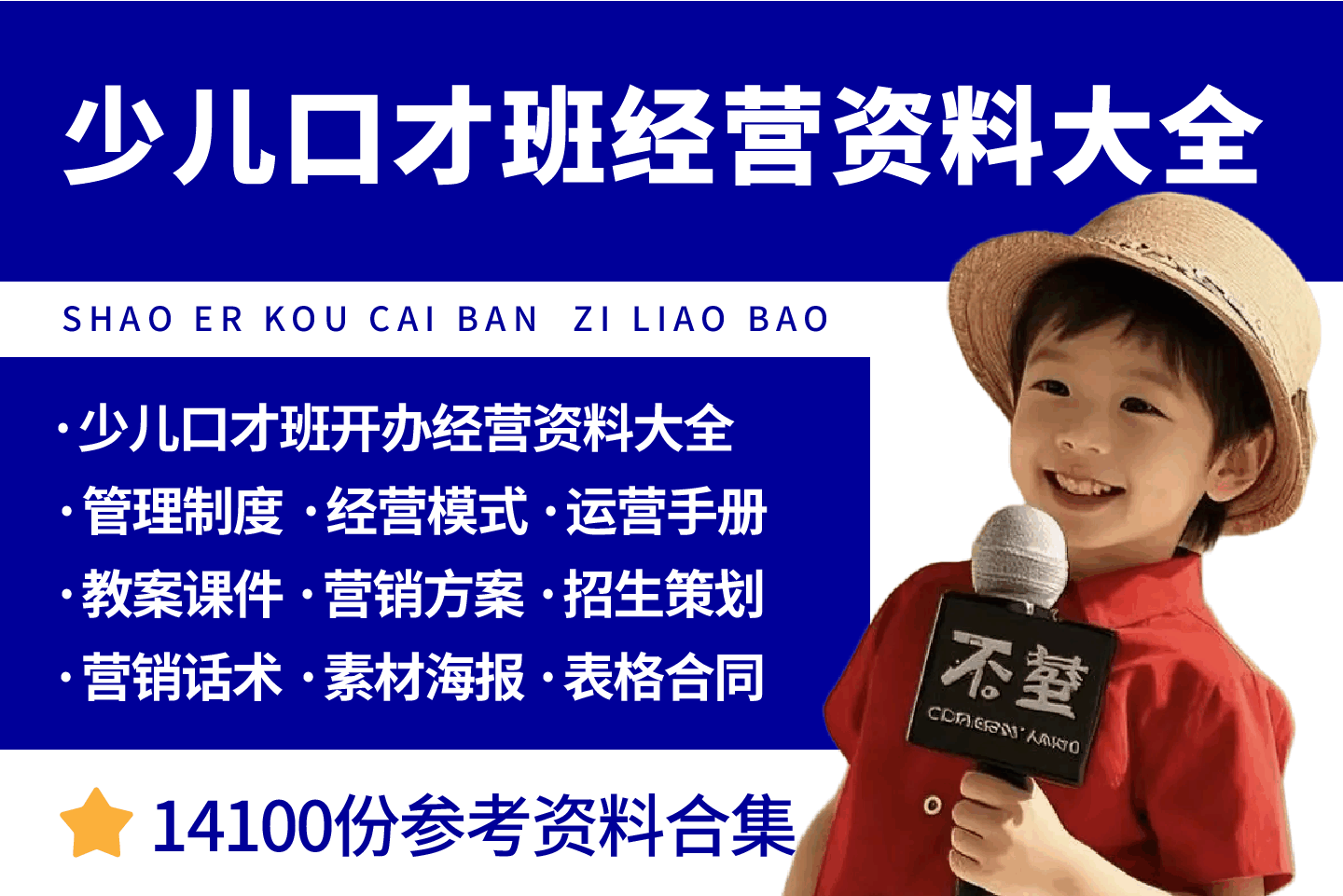 少儿口才培训班经营管理资料大全:我们为您提供创业开少儿口才班经营参考资料,包含管理制度、经营模式、运营手册、教案课件、营销方案、招生策划、营销话术、素材海报、表格合同等少儿口才班开办经营参考资料,电子版文件,简单修改即可应用,为您开少儿口才班提供经营参考资料。