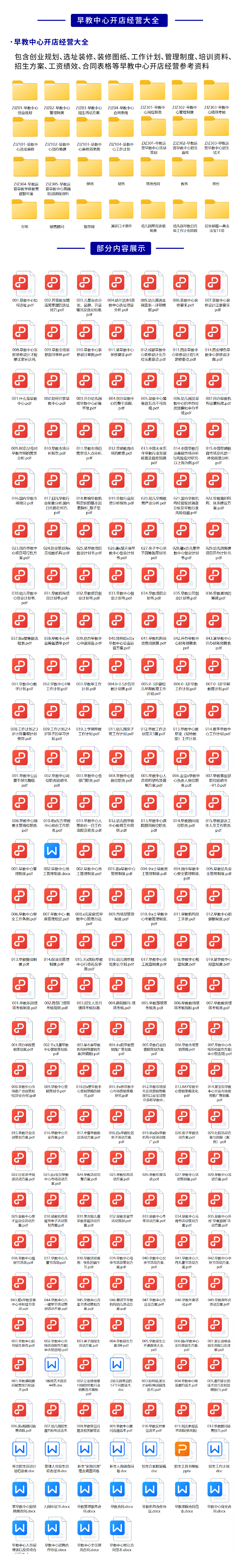 早教中心开店经营资料大全:我们为您提供创业开办早教中心开店经营参考资料,包含创业规划、选址装修、装修图纸、工作计划、管理制度、培训资料、招生方案、工资绩效、合同表格等早教中心开店经营参考资料,电子版文件,简单修改即可应用,为您开早教中心提供经营参考资料