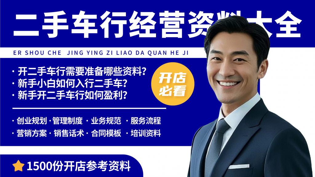 第一个问题到是很简单,青创社资源站,各类资料网站、一些行业论坛跟贴吧,很多地方都能找到二手车行经营管理参考资料包,梳理下二手车行创业规划、二手车行经营管理制度、二手车行营销策划、二手车行销售技巧话术、二手车员工培训资料、二手车行合同表格模板,这些开店一定会用到的资料,带着问题找答案,基本你就能对整个二手车行的经营模式跟业务流程有一个相对了解了,然后再找家二手车行,实践下实操细节,基本就算入门了。