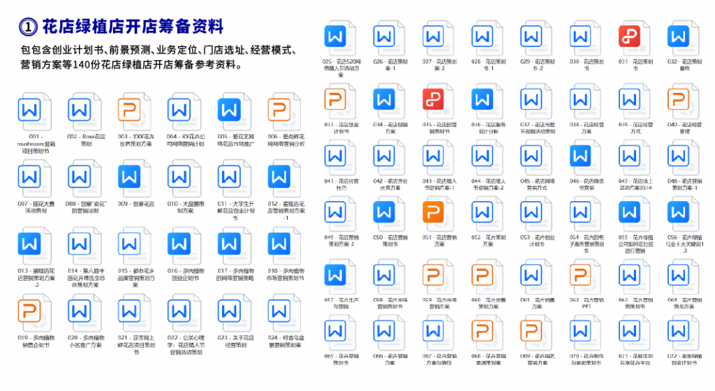 去百度、贴吧、知乎等渠道搜集或者青创社资源站、各类资料文库等分享平台找经营参考资料包,按照创业计划书、经营模式、管理制度、营销方案、促销活动、常用文档表格、插花花艺教程以及各类花艺花篮风格参考图这几项类目去搜集准备好,成品资料包的话费用成本也就几十块。