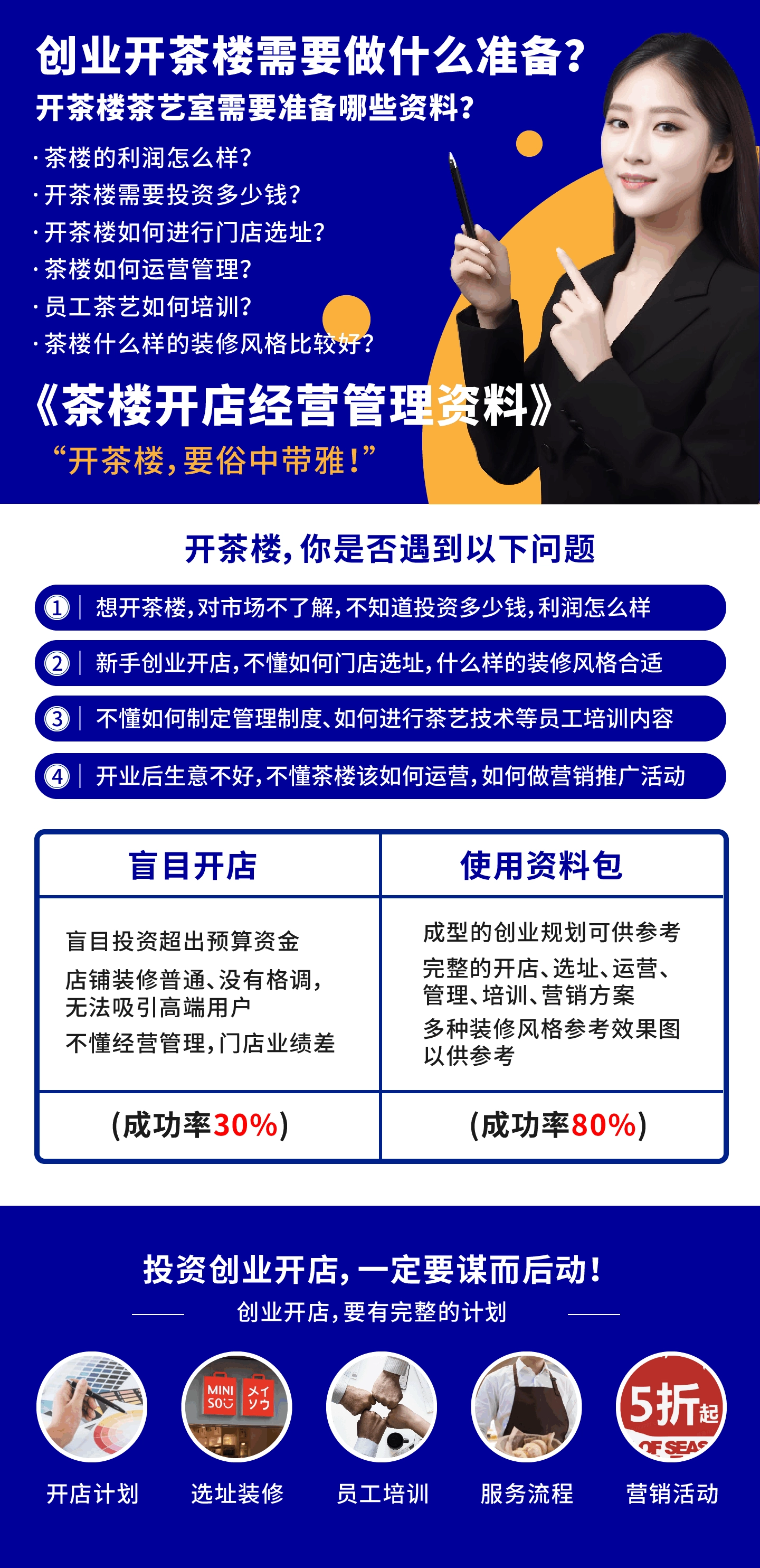 茶楼茶艺馆开店经营管理资料大全:包含茶楼装修风格参考图、创业规划、市场调研、利润分析、开店指南、选址装修、茶艺培训资料、茶叶知识文案、管理制度、活动策划、营销案例、常用表格等172份茶楼茶艺馆开店经营管理参考资料。 茶楼茶艺馆开店经营管理资料大全