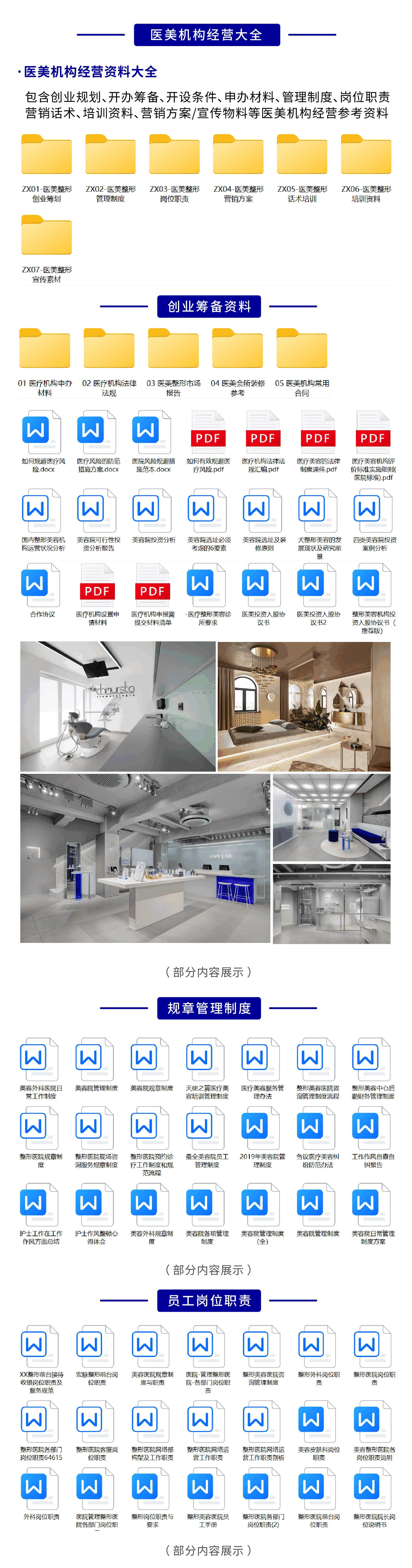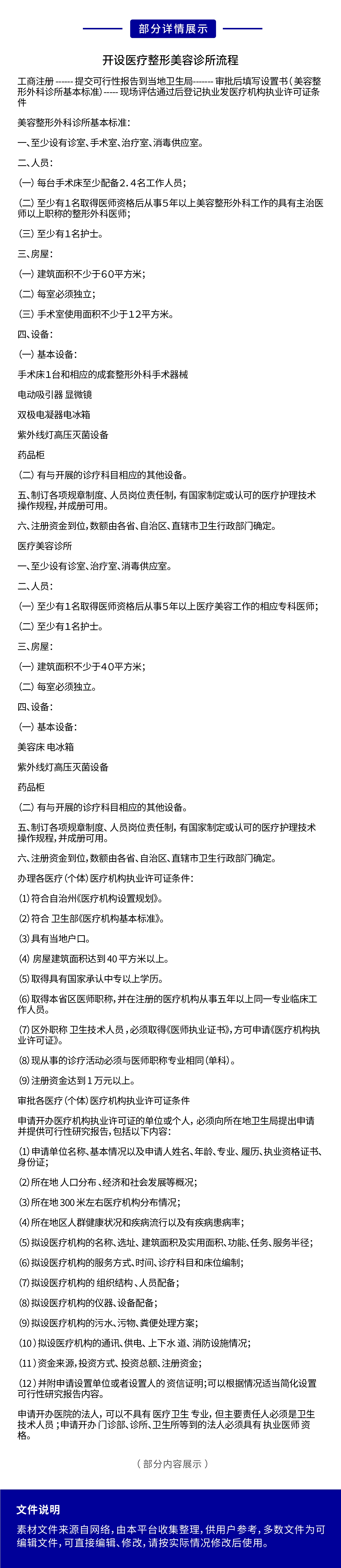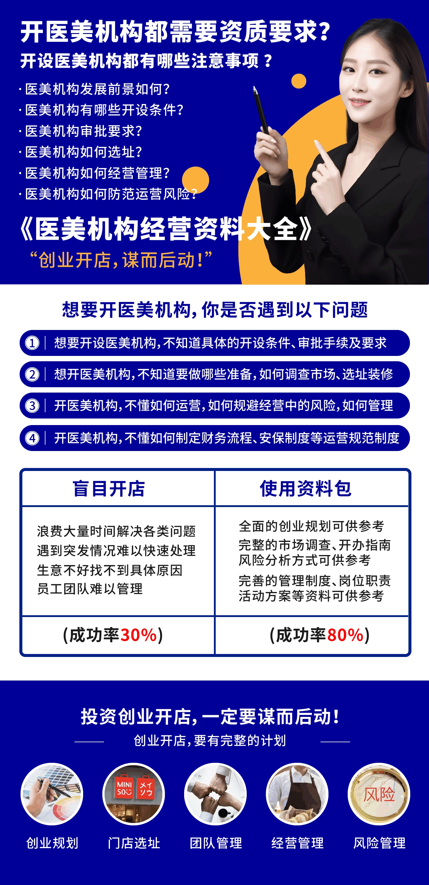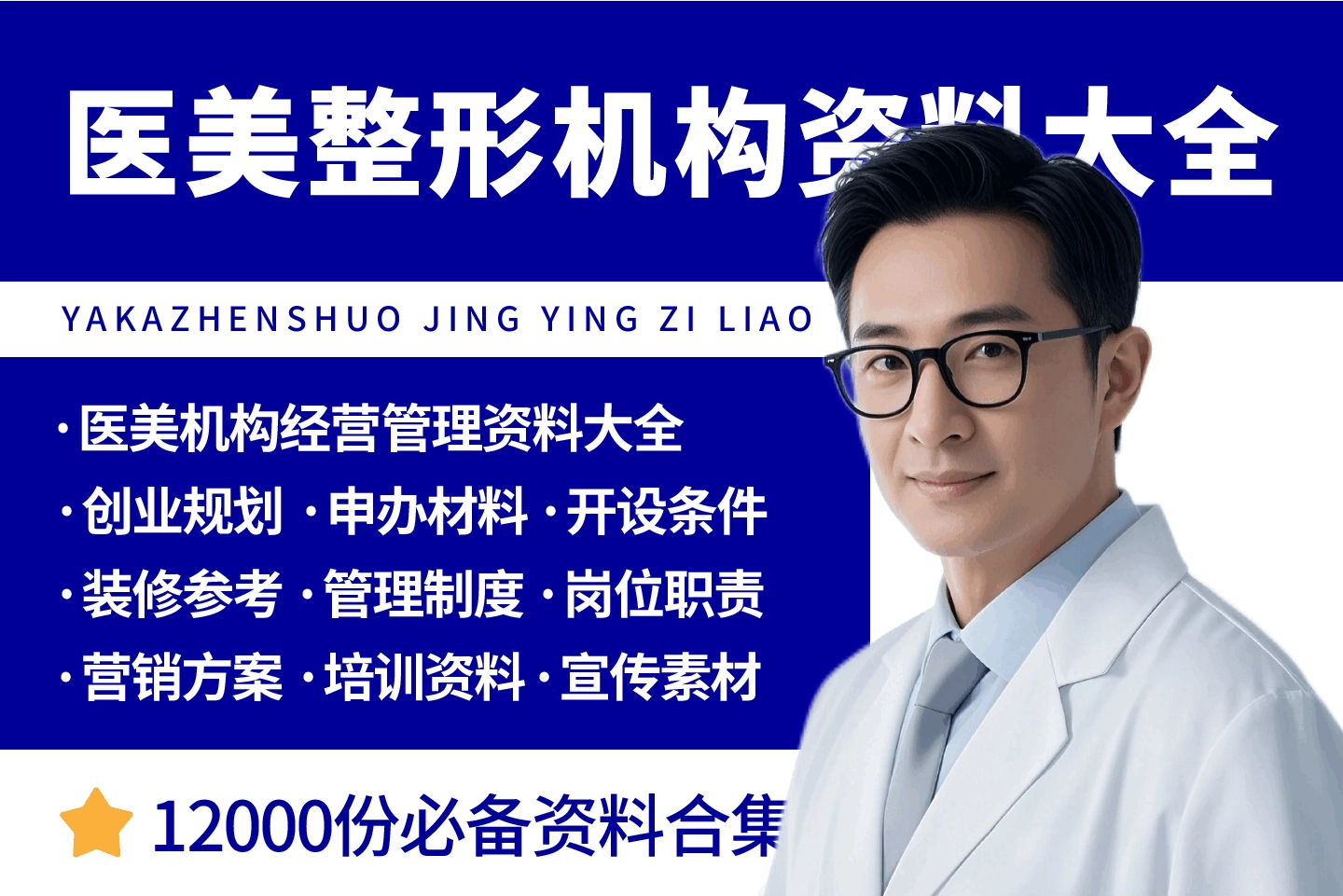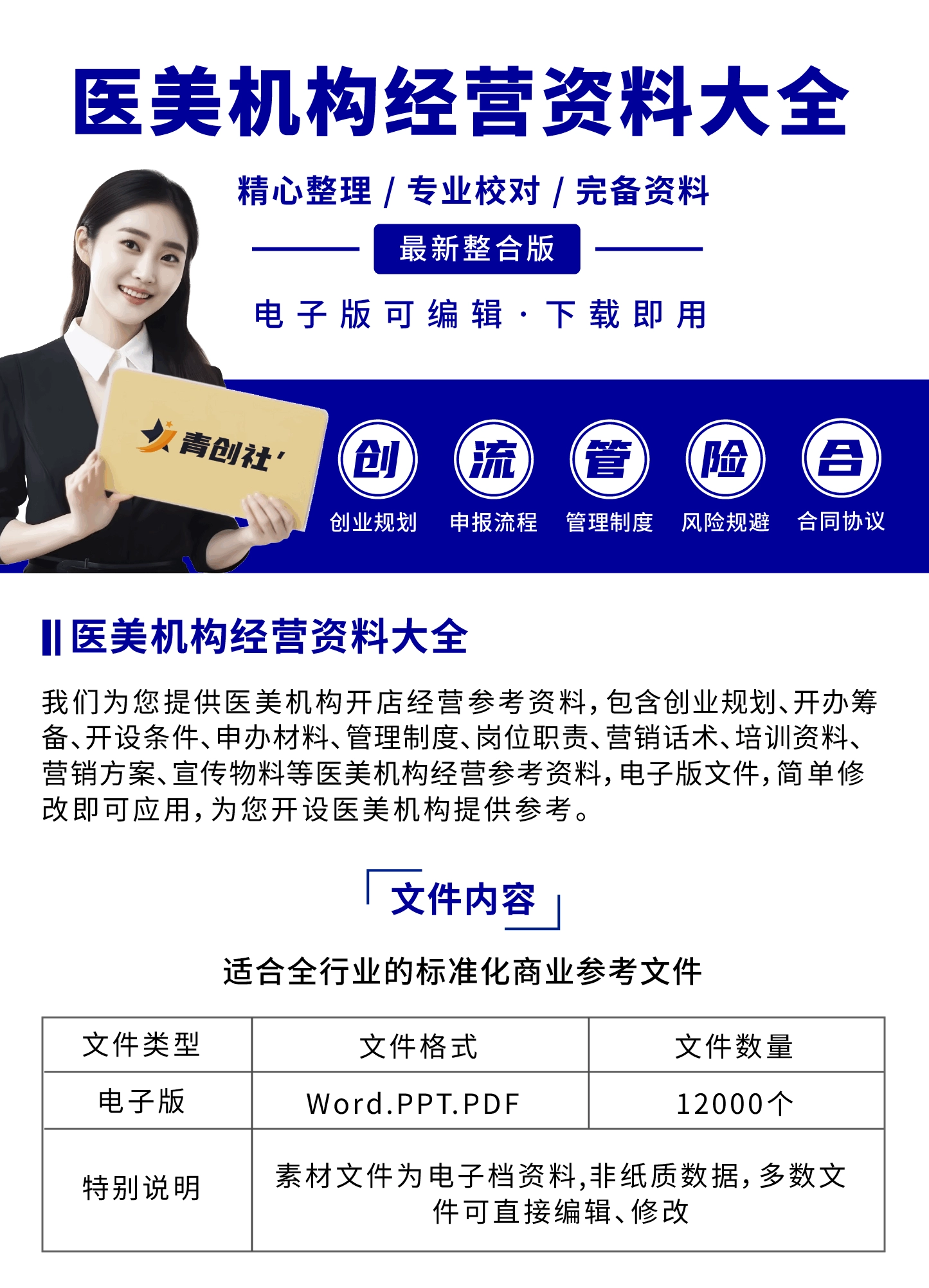 医美诊所整形机构开店经营管理资料大全:我们为您提供医美机构开店经营参考资料,包含创业规划、开办筹备、开设条件、申办材料、管理制度、岗位职责、营销话术、培训资料、营销方案、宣传物料等医美机构经营参考资料,电子版文件,简单修改即可应用,为您开设医美机构提供参考。