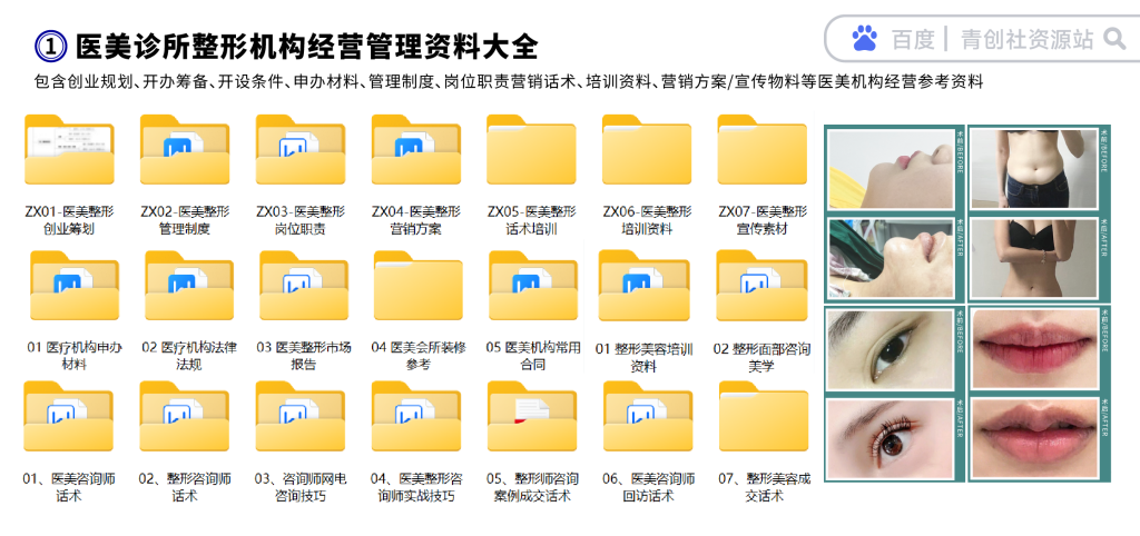 新手想要开一家医美诊所,没经验的话,可以去青创社资源站,或则行业论坛、交流社区等渠道,收集整理医美整形机构经营参考资料,包含创业规划、开办筹备、开设条件、申办材料、管理制度、岗位职责、营销话术、培训资料、营销方案、宣传物料等医美机构经营参考资料,让你对医美诊所的经营有一个思路。