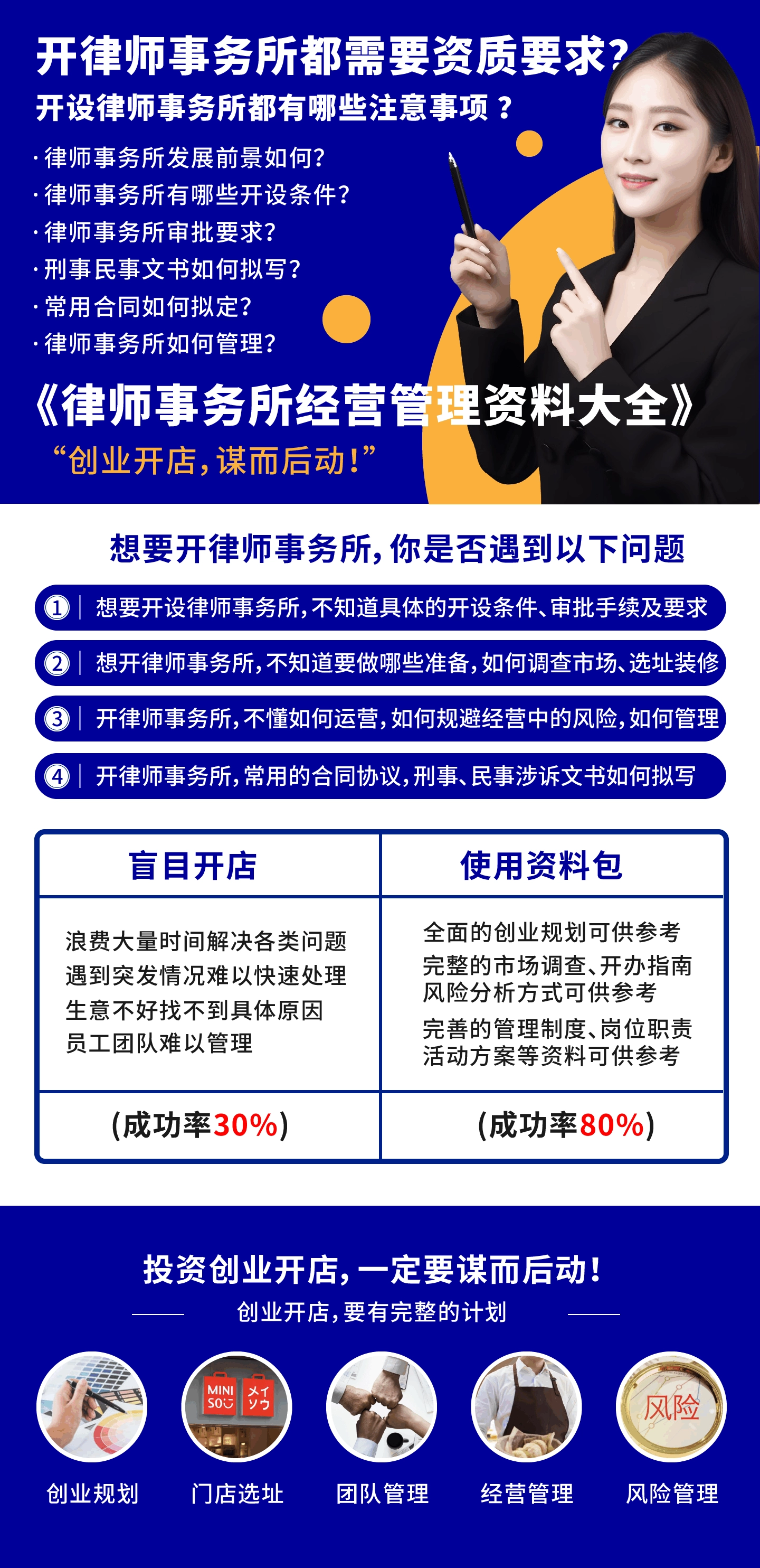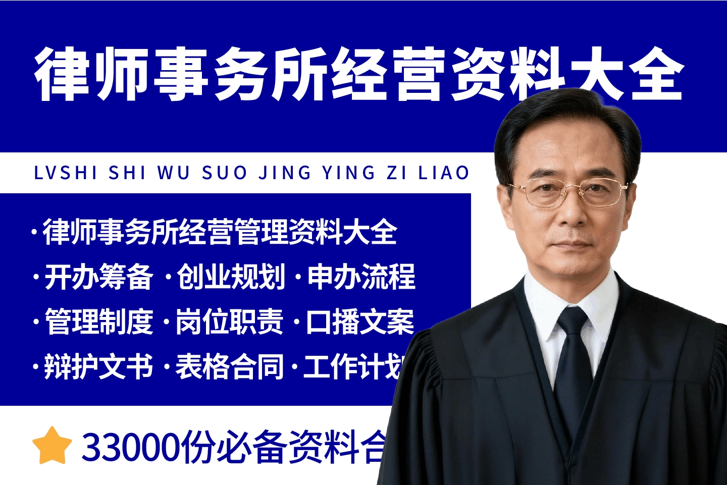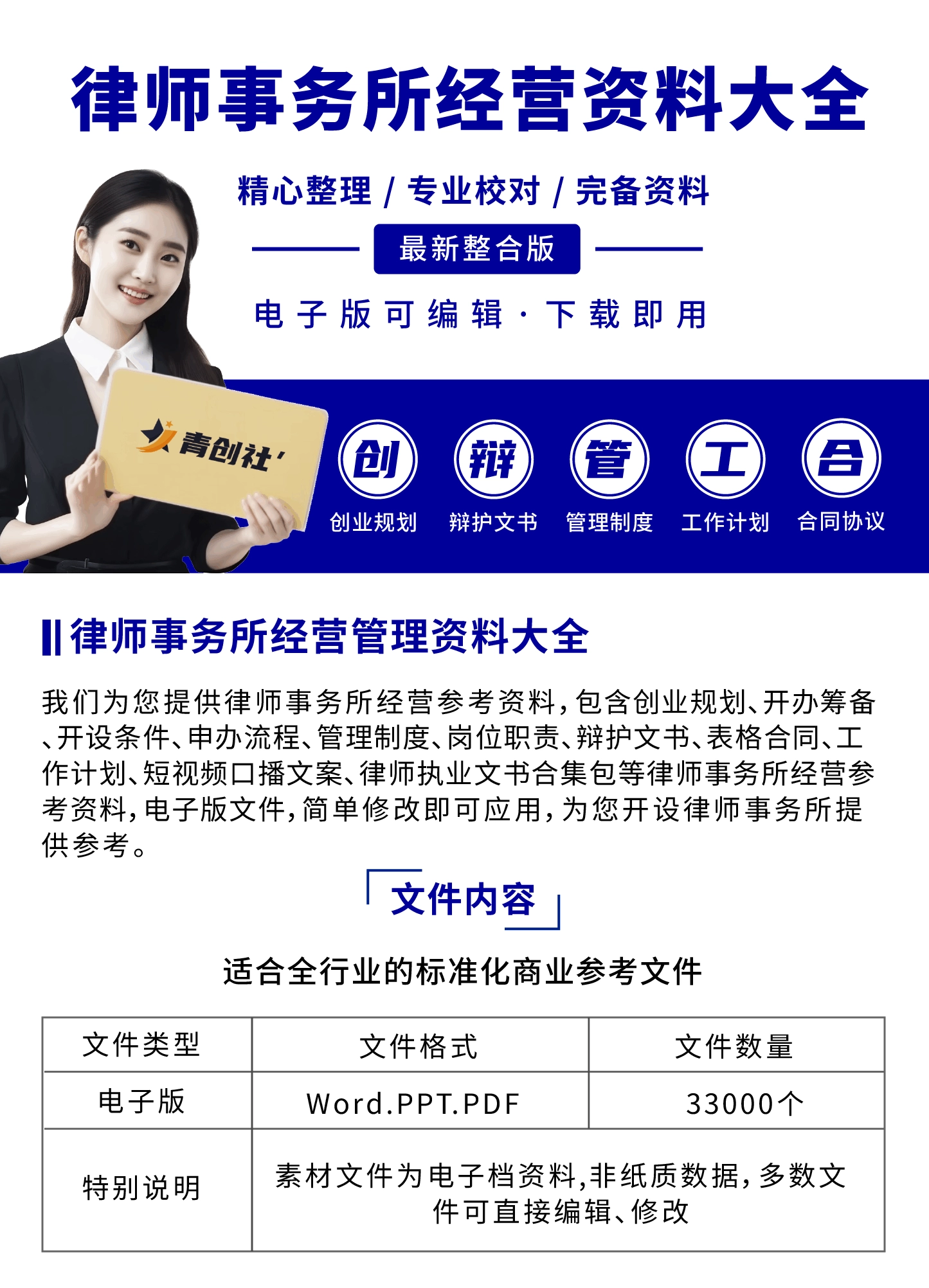 律师事务所开办经营管理资料大全:我们为您提供律师事务所经营参考资料,包含创业规划、开办筹备、开设条件、申办流程、管理制度、岗位职责、辩护文书、表格合同、工作计划、短视频口播文案、律师执业文书合集包等律师事务所经营参考资料,电子版文件,简单修改即可应用,为您开设律师事务所提供参考。