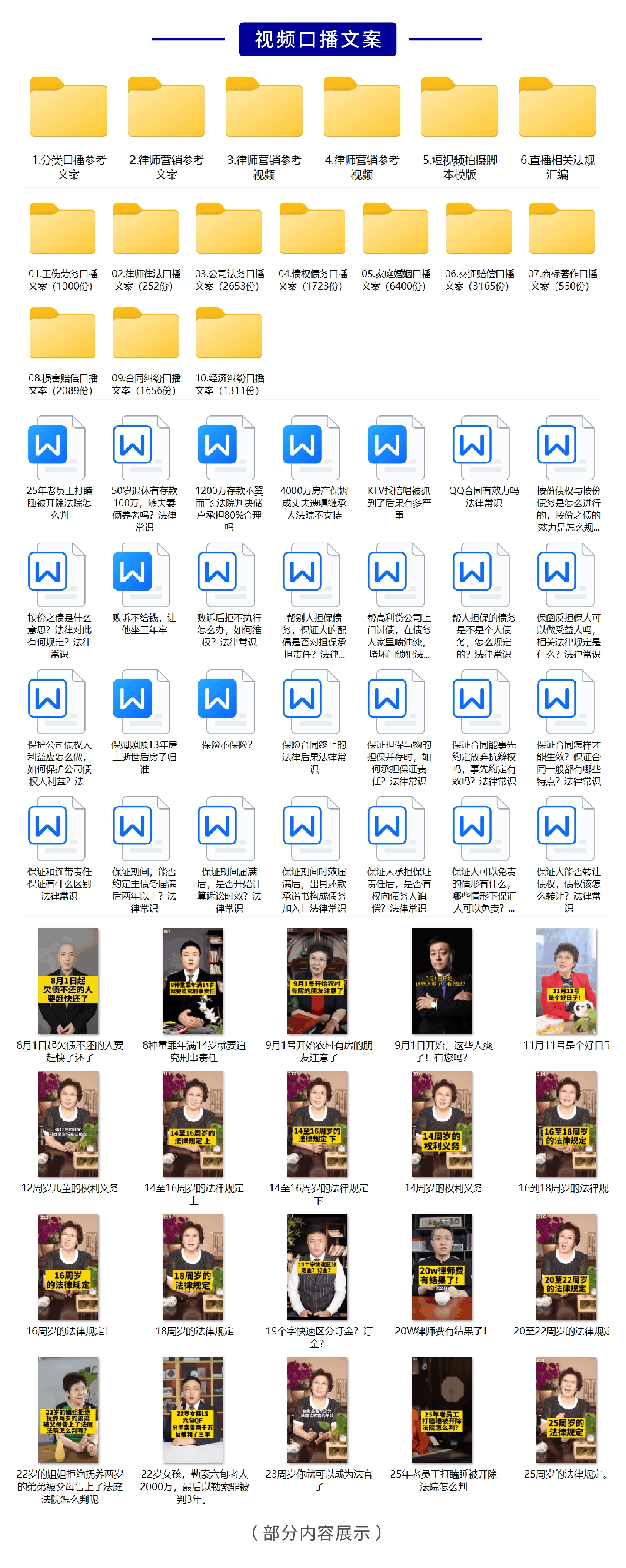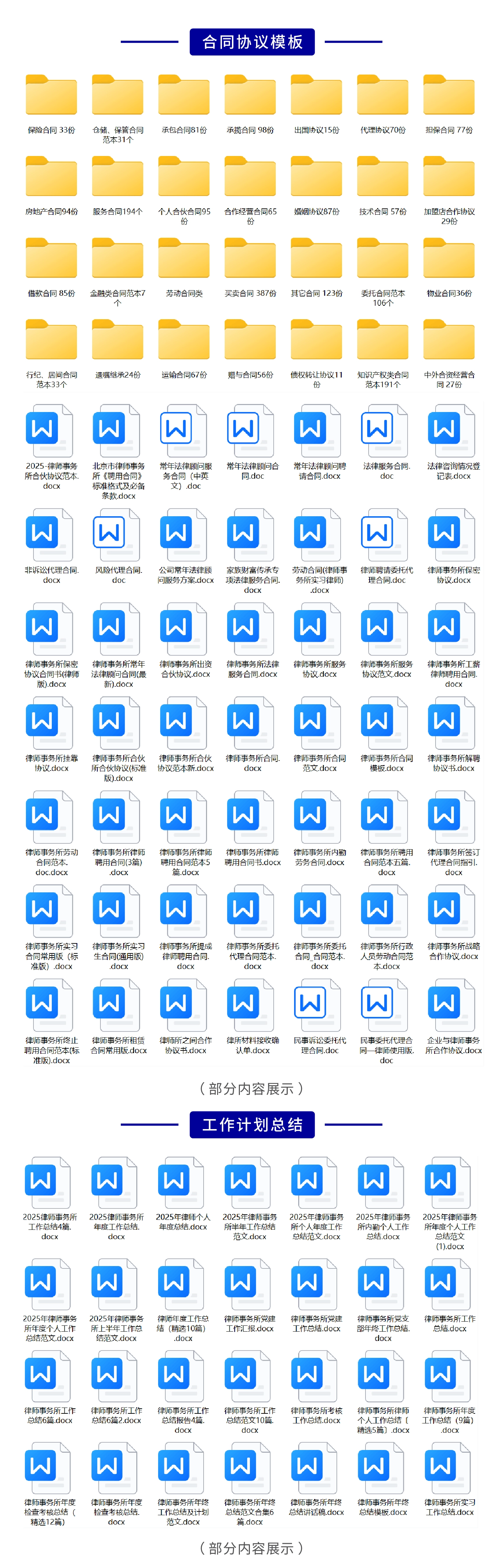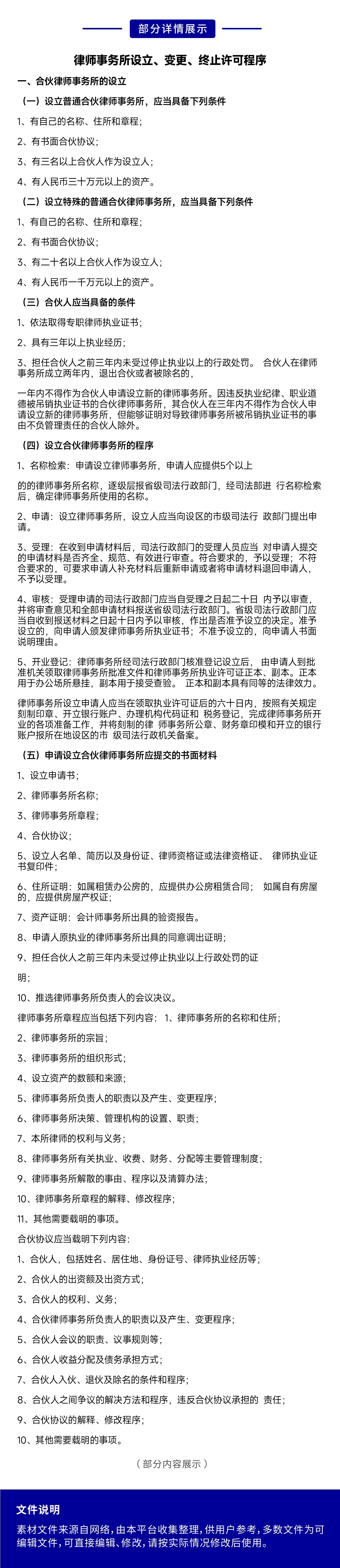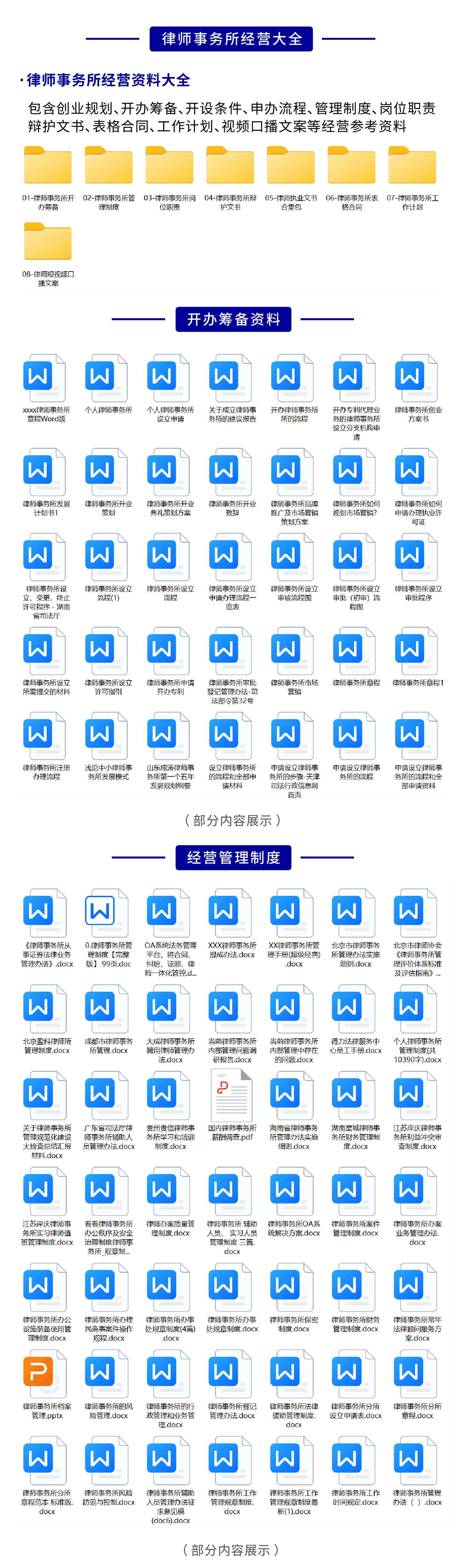 律师事务所开办经营管理资料大全:我们为您提供律师事务所经营参考资料,包含创业规划、开办筹备、开设条件、申办流程、管理制度、岗位职责、辩护文书、表格合同、工作计划、短视频口播文案、律师执业文书合集包等律师事务所经营参考资料,电子版文件,简单修改即可应用,为您开设律师事务所提供参考。