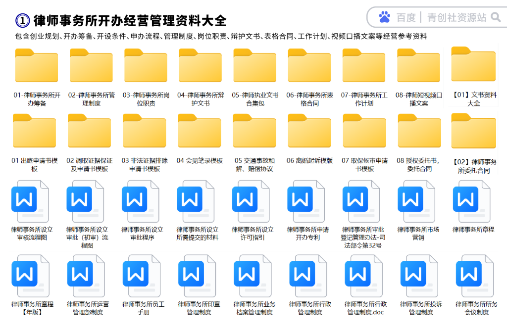新手想要开一家律师事务所,如果没有经验,一定要提前去青创社资源站、行业交流论坛、经营资料文库,去收集整理好这些资料,包含开办筹备资料、管理制度、岗位职责、辩护文书、合同协议、工作计划、短视频口播文案等资料,这些资料能都是开办律所必备的资料,能节省你大量的时间。